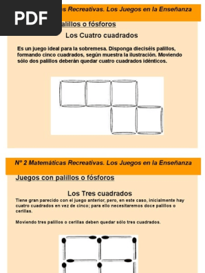 Juego de los 15 fósforos by claudio escobar. Una pregunta caprichosa que admite múltiples respuestas. Juegos con palillos o fósforos los tres cuadrados tiene gran parecido con el juego anterior, pero, en este caso, inicialmente hay cuatro cuadrados en vez de cinco; Es necesario tener en cuenta esto, al buscar los métodos más adecuados para transmitir a los alumnos el interés y el entusiasmo que las matemáticas pueden generar, y para comenzar a familiarizarlos con los procesos comunes de la actividad matemática. Es hora de desafiar a tu cerebro y proteger tu materia gris del alzheimer. Diviértete con estos juegos numéricos de aritmética y aprende habilidades mentales que siempre te serán de utilidad. Solo hay echar un vistazo a los juegos de mesa para ver que las matemáticas están ahí: Pero hoy en día los juegos de mesa han perdido un poco de popularidad en favor de los juegos para dispositivos móviles. Los números en casillas amarillas sumas puntos, mientras que los de las casillas marrones restan. Antes de ver la solución tómate unos minutos más y trata de resolverlo. En algunos puedes dedicarte a resolver ecuaciones. Taller de matemáticastaller de matemáticas • trabajando el ingenio de los alumnos de san rafael jugando con palitos de fòsforos prof. Enviar por correo electrónico escribe un blog compartir con twitter compartir con facebook compartir en pinterest.